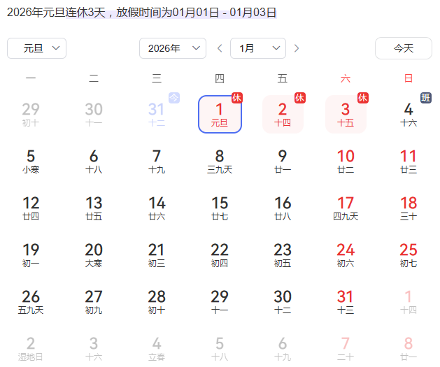 元旦:1月1日(周四)至3日(周六)放假调休,共3天。1月4日(周日)上班